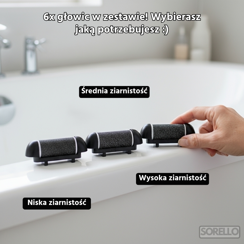 Zestaw zawiera 6 wymiennych głowic o różnej gradacji. Dzięki nim zadbasz zarówno o delikatną skórę, jak i o mocne zrogowacenia.